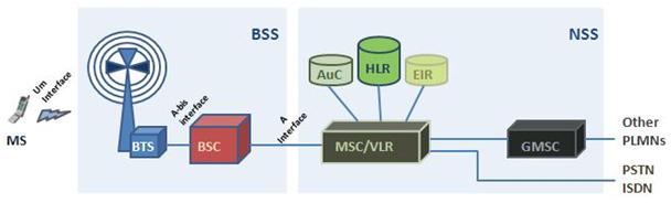 Base Station Controller (BSC): Maintains radio connections towards MS and terrestrial connection towards the NSS.